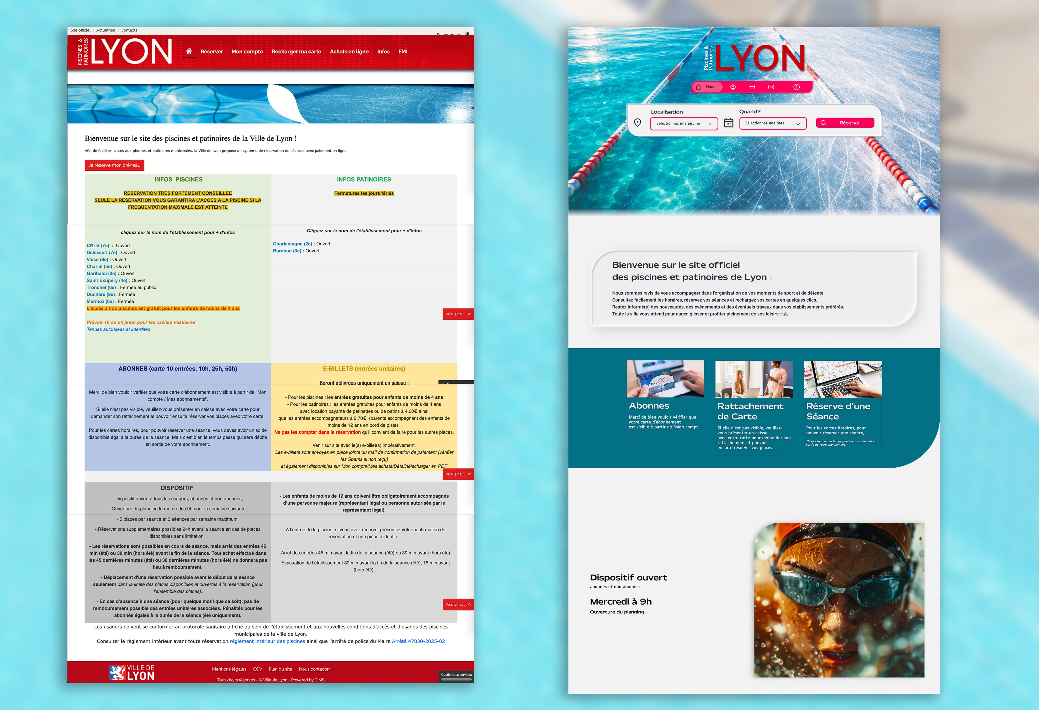 The Ville de Lyon's website for public pools and ice rinks was outdated and visually inconsistent, making it difficult for users to find information or book reservations.